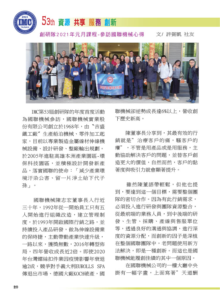 創研隊元月課程-參訪國聯機械心得 / 許弼凱 社友撰稿