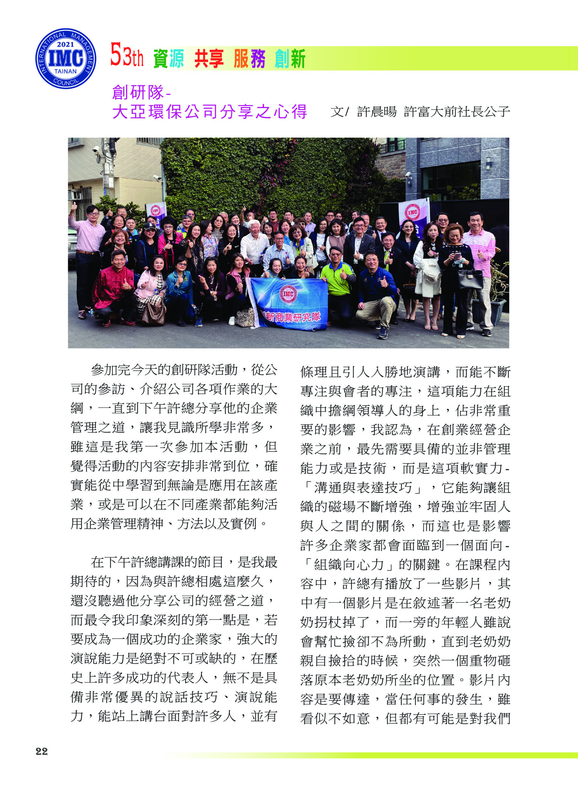 創研隊-大亞環保公司分享之心得 許辰暘/許富大 撰稿 ad2021-05-04T15:03:01+08:0015 4 月, 2021|創研隊, 最新消息, 社友分享| FacebookXRedditLinkedInWhatsAppTumblrPinterestVkXingEmail: 相關文章: 台南IMC第58屆三月份電子月刊 台南IMC第58屆三月份電子月刊 20260315愛心公益捐血活動 20260315愛心公益捐血活動 台南IMC第58屆二月份電子月刊 台南IMC第58屆二月份電子月刊 第57-58年會交接特刊 第57-58年會交接特刊