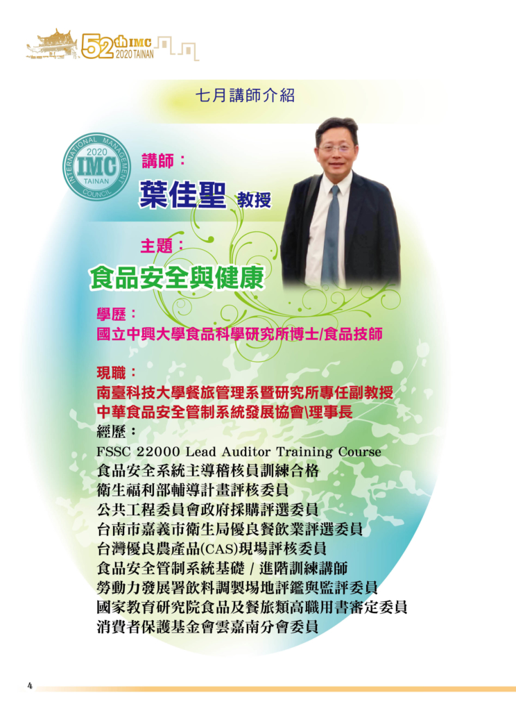 第52屆 20200721 例會講師:葉佳聖 主題:食品安全與健康 it2020-07-23T15:32:18+08:0021 7 月, 2020|最新消息, 月例會, 講師資料| FacebookXRedditLinkedInWhatsAppTumblrPinterestVkXingEmail: 相關文章: 台南IMC第58屆三月份電子月刊 台南IMC第58屆三月份電子月刊 20260315愛心公益捐血活動 20260315愛心公益捐血活動 台南IMC第58屆二月份電子月刊 台南IMC第58屆二月份電子月刊 2026120元月份月例會-邀請梅國卿策略長蒞會演講 2026120元月份月例會-邀請梅國卿策略長蒞會演講