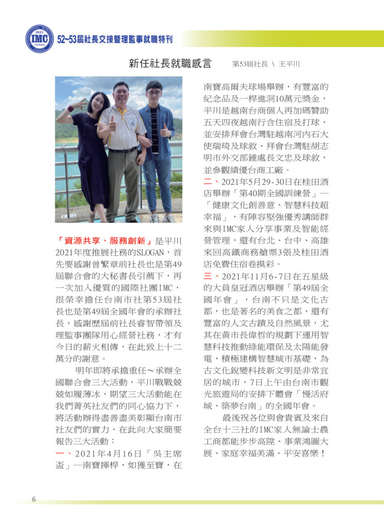 12月新任社長的話-第五十三 屆社長 王川平 ad2021-05-14T11:28:17+08:0020 12 月, 2020|最新消息, 社長的話| FacebookXRedditLinkedInWhatsAppTumblrPinterestVkXingEmail: 相關文章: 台南IMC第58屆三月份電子月刊 台南IMC第58屆三月份電子月刊 20260315愛心公益捐血活動 20260315愛心公益捐血活動 台南IMC第58屆二月份電子月刊 台南IMC第58屆二月份電子月刊 第58屆元月月刊社長的話 第58屆元月月刊社長的話
