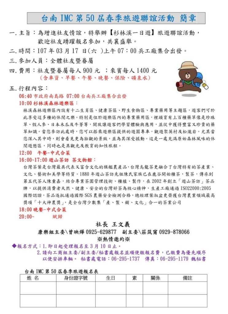 20180317 第50屆春季旅遊聯誼活動 簡章 it2018-12-29T22:43:23+08:0013 2 月, 2018|最新消息, 活動資訊| FacebookXRedditLinkedInWhatsAppTumblrPinterestVkXingEmail: 相關文章: 台南IMC第58屆四月份電子月刊 台南IMC第58屆四月份電子月刊 台南IMC第58屆三月份電子月刊 台南IMC第58屆三月份電子月刊 20260315愛心公益捐血活動 20260315愛心公益捐血活動 台南IMC第58屆二月份電子月刊 台南IMC第58屆二月份電子月刊