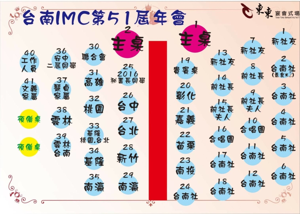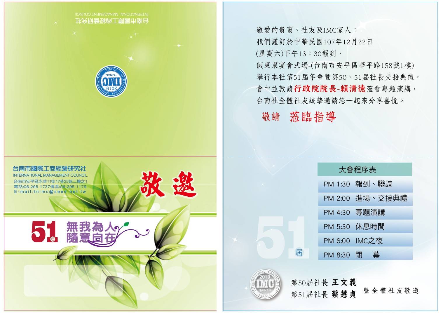20181222 台南IMC第51屆年會暨社長交接典禮 台南IMC第51屆年會暨社長交接典禮 時間:107年12月22日(星期六)下午1:30 地點:東東宴會式場1樓-東瀛廳 講師:行政院院長-賴清德 演講主題:安居樂業•生生不息•均衡台灣 it2018-12-29T22:40:06+08:009 11 月, 2018|最新消息, 活動資訊| FacebookXRedditLinkedInWhatsAppTumblrPinterestVkXingEmail: 相關文章: 台南IMC第58屆三月份電子月刊 台南IMC第58屆三月份電子月刊 20260315愛心公益捐血活動 20260315愛心公益捐血活動 台南IMC第58屆二月份電子月刊 台南IMC第58屆二月份電子月刊 第57-58年會交接特刊 第57-58年會交接特刊