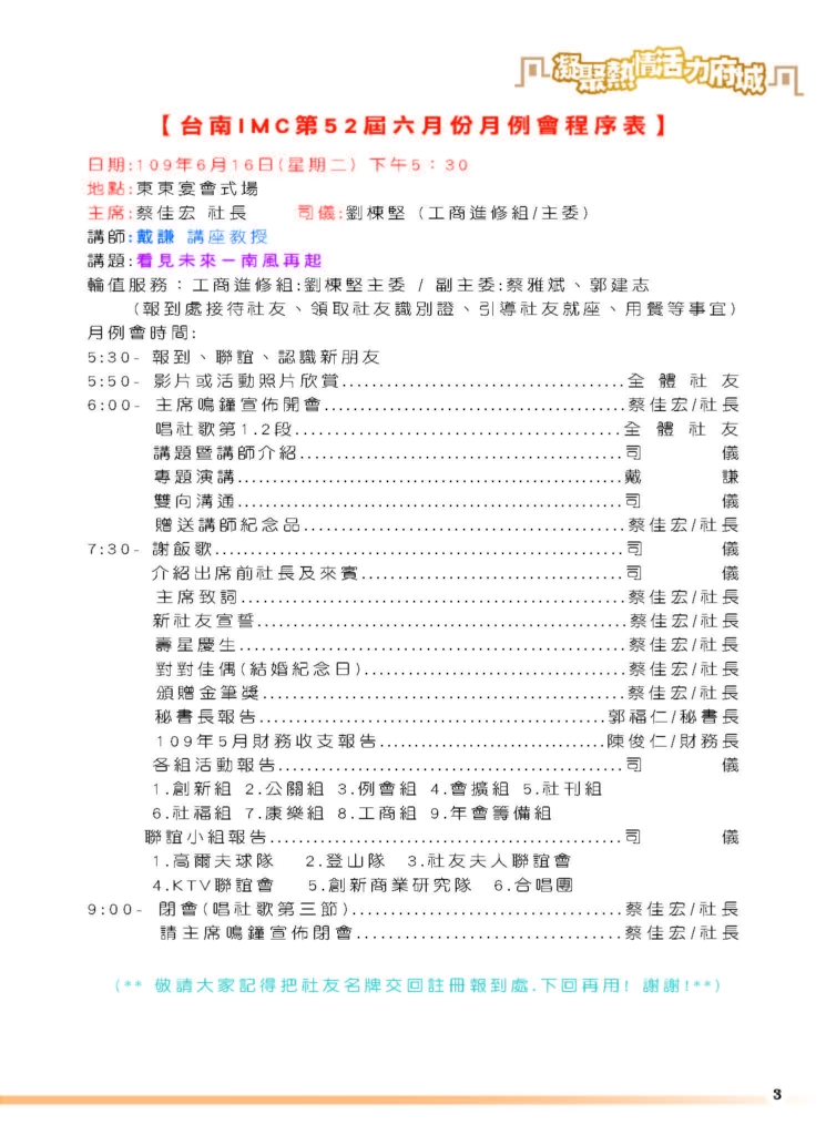 20200616 第52屆6月例會程序表 it2020-07-23T15:29:29+08:0016 6 月, 2020|最新消息, 月例會| FacebookXRedditLinkedInWhatsAppTumblrPinterestVkXingEmail: 相關文章: 台南IMC第58屆三月份電子月刊 台南IMC第58屆三月份電子月刊 20260315愛心公益捐血活動 20260315愛心公益捐血活動 台南IMC第58屆二月份電子月刊 台南IMC第58屆二月份電子月刊 2026120元月份月例會-邀請梅國卿策略長蒞會演講 2026120元月份月例會-邀請梅國卿策略長蒞會演講